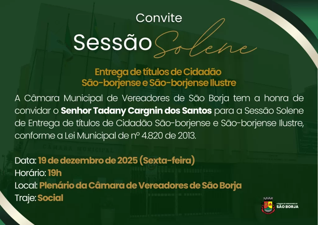 With immense gratitude and deep emotion, I receive the news of being granted the Honorary Title of Distinguished Citizen of São Borja, unanimously approved by the City Congress of São Borja.
