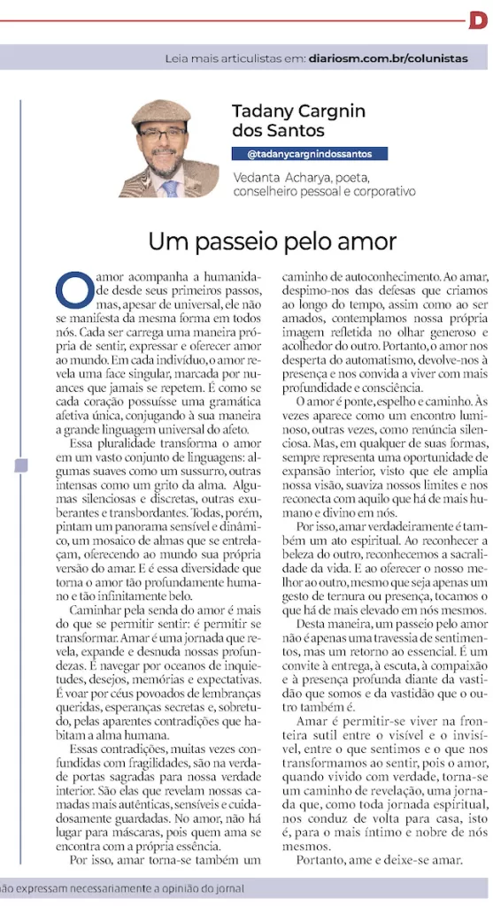 O amor é ponte, espelho e caminho. Às vezes aparece como um encontro luminoso, outras vezes, como renúncia silenciosa. Mas, em qualquer de suas formas, sempre representa uma oportunidade de expansão interior, visto que ele amplia nossa visão, suaviza nossos limites e nos reconecta com aquilo que há de mais humano e divino em nós.